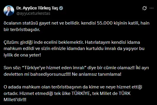 "öcalanın statüsü gayet net ve bellidir. kendisi 55.000 kişinin katili, hain bir teröristbaşıdır. Çözüm: girdiği inde ecelini beklemektir. Hatırlatayım kendisi idama mahkum edildi ve sizin elinizle idamdan kurtuldu imralı da yaşıyor bu iyilik de ona yeter! Son söz: “Türkiye’ye hizmet eden imralı” diye bir cümle olamaz!! İki ayrı devletten mi bahsediyorsunuz!!!! Ne anlamsız tanımlama! O adada mahkum olan teröristbaşının da kime ve neye hizmet ettiği ortadır. Hizmet etmediği tek ülke TÜRKİYE, tek Millet de TÜRK Milleti’dir!!!"