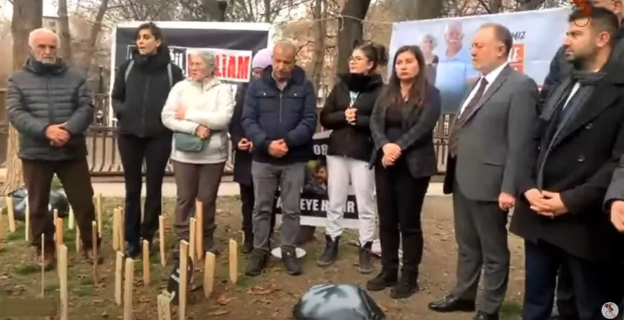 Açıklamanın yapıldığı yerin önünde bulunan Topraklık alana, tahtalardan yapılma kazıklar dikilerek temsili mezarlıklar yapıldığı görüldü. Alan, pankartların ve depremlerde enkaz altında yaşamını yitiren yurttaşların fotoğraflarıyla donatıldı.