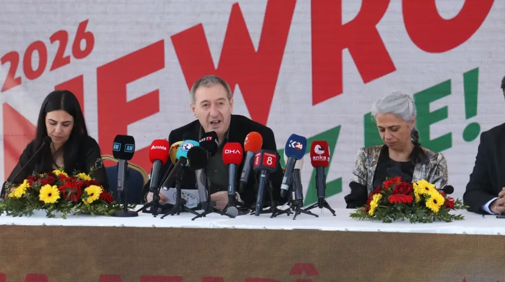 DEM Parti Eş Genel Başkanı Tuncer Bakırhan, beraberinde bulunan Demokratik Bölgeler Partisi (DBP) Eş Genel Başkanı Çiğdem Kılıçgün Uçar, Diyarbakır Büyükşehir Belediyesi Eş Başkanları Ayşe Serra Bucak ve Doğan Hatun ile Nevruz deklarasyonu için Yenişehir ilçesinde bulunan Sümer Park'ta açıklama yaptı.