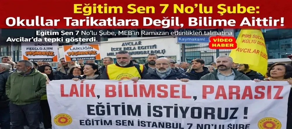 Eğitim Sen 7 No’lu Şube, Avcılar İlçe Milli Eğitim Müdürlüğü önünde yaptığı açıklamada MEB’in Ramazan etkinlikleri talimatına tepki gösterdi. Pir Sultan temsilcileri de açıklamaya yoğun katılım sağladı.