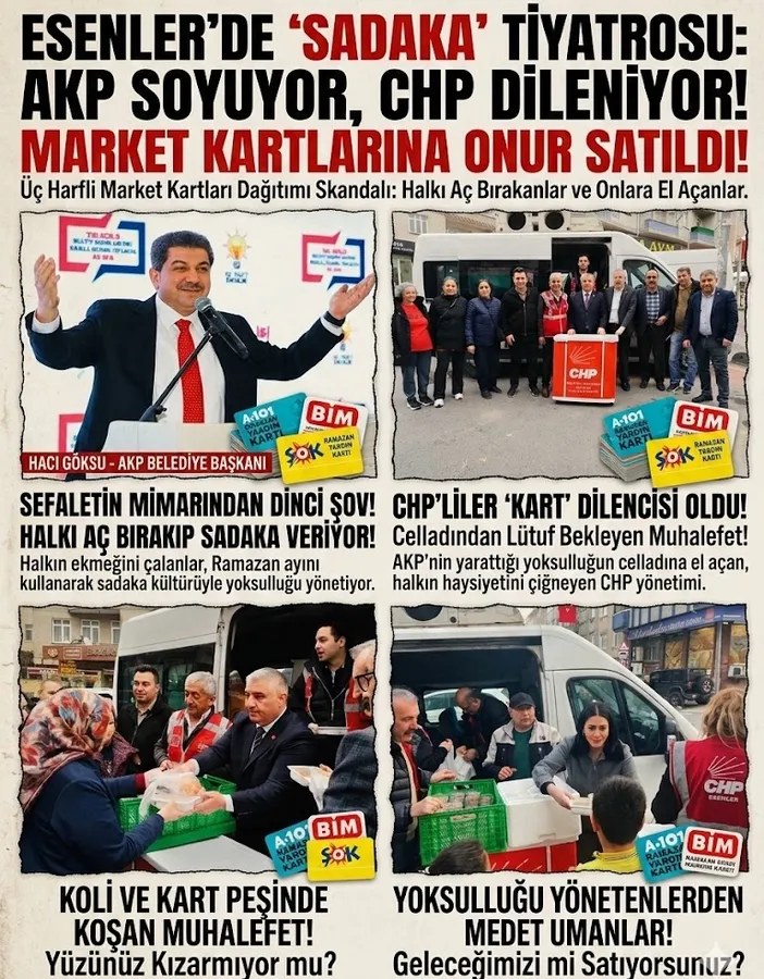 Bugün AKP’li belediye başkanına el açıp üç harfli market kartlarına tenezzül eden bu CHP yönetimi, yarın halkı celladına teslim ederken hiç utanmayacaktır. Bu halk, kendisini açlığa mahkûm edenle, o açlıktan "yardım kartı" devşirmeye çalışan bu yüzsüz siyaset anlayışını asla unutmayacak! Esenler halkı uyanmalıdır: Bir yanda cebinizi boşaltanlar, diğer yanda o boş cebinize başkasının sadakasını koymaya kalkanlar var. Bu döngüden ne hayır gelir ne de adalet